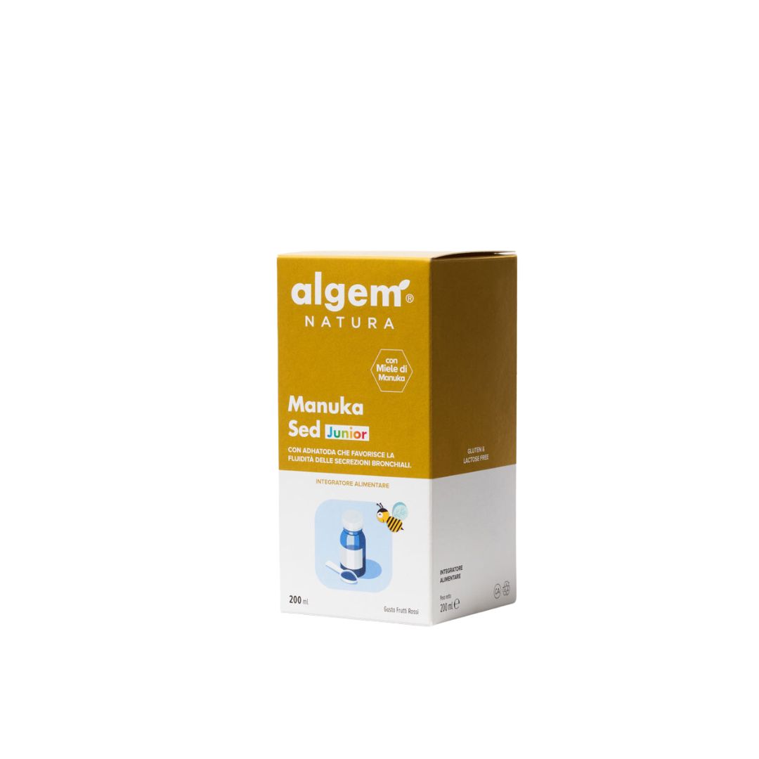 Manuka Sed Tosse Junior is a food supplement based on Manuka Honey and plant extracts of Althea and Plantain which promote the functionality of the mucous membranes of the respiratory system, in association with Adhatoda and Thyme which promote the fluidity of bronchial secretions.Algem Manuka Sed Junior, in addition to the excellent Manuka Honey, contains various natural extracts which increase its effectiveness.Marshmallow and Plantain help promote the functionality of the mucous membranes of the respiratory system by counteracting dryness of the throat and cough . Finally , Adhatoda and Thyme, thanks to their mucolytic and inspection properties, promote the fluidity of bronchial secretions.For the correct use of the product in the early years of your child’s age, it is advisable to consult your doctor. In the case of diabetics, ask your doctor for preventive advice. Do not exceed the recommended daily dose.Supplements are not intended as substitutes for a varied and balanced diet and a healthy lifestyle. Avoid in case of proven hypersensitivity to one or more ingredients. Store in a cool, dry place, away from heat sources.
