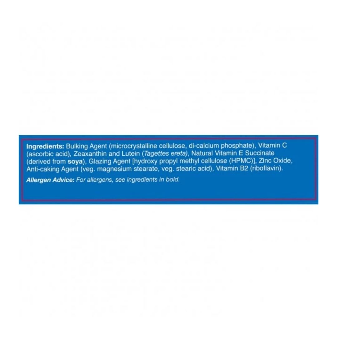 Bulking Agent (microcrystalline cellulose, di-calcium phosphate), Vitamin C (ascorbic acid), Zeaxanthin and Lutein (Tagettes ereta), Natural Vitamin E Succinate, Glazing Agent [hydroxyl propyl methyl cellulose (HPMC)], Zinc Oxide, Anti-caking Agent (veg.