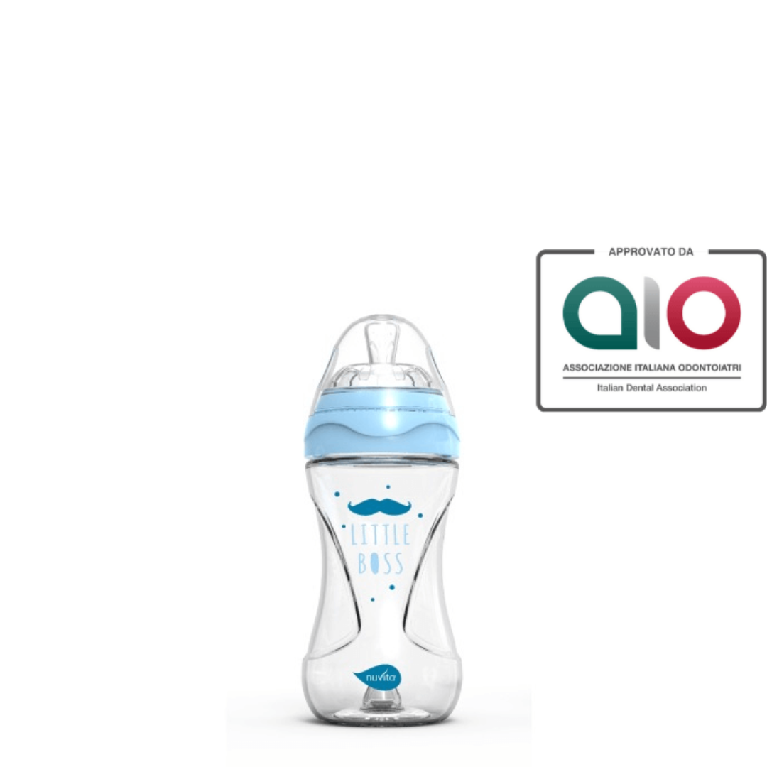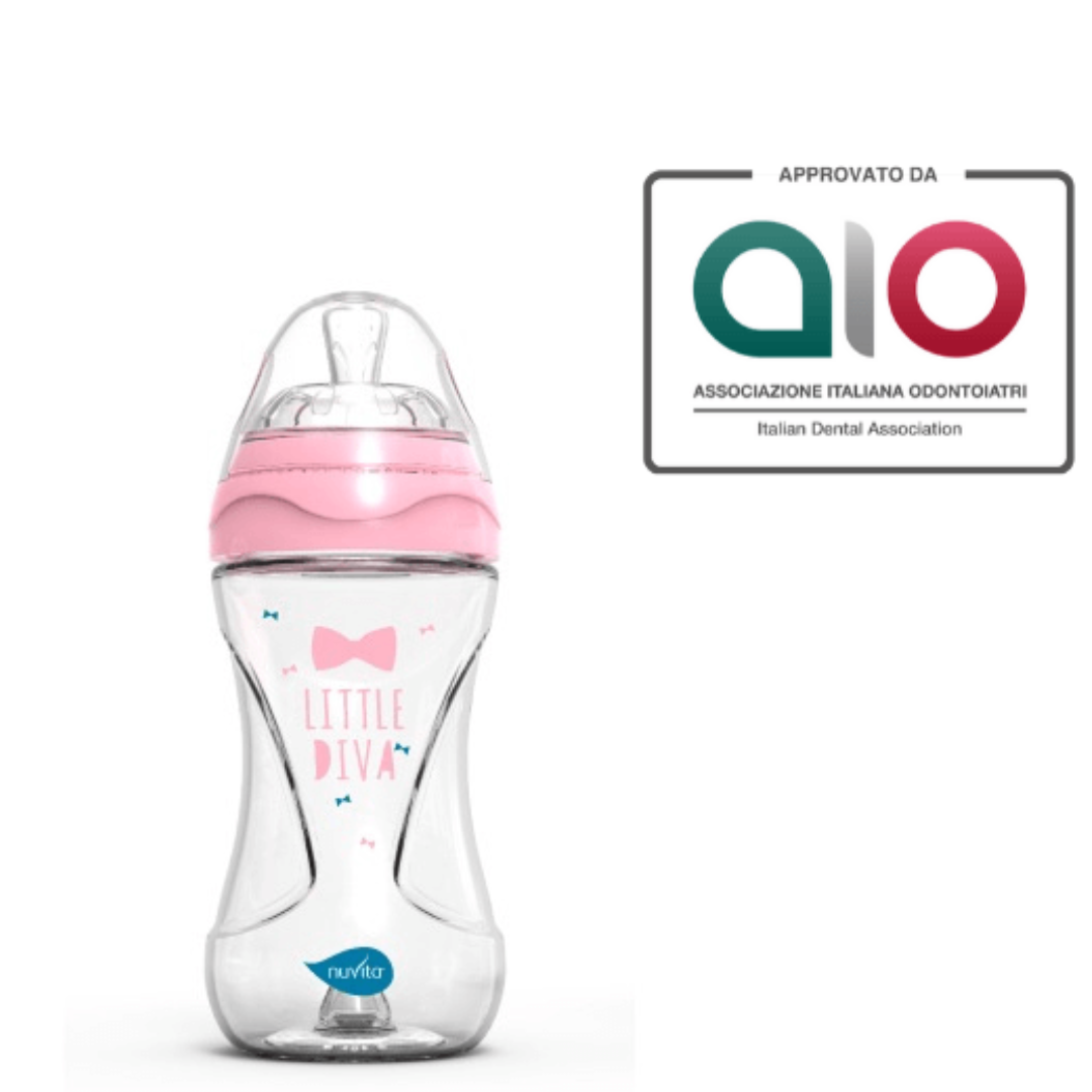 Promotes breast-bottle alternationSpecial teat that mimics the mother’s breastAIO approved – Italian Dental AssociationThe only glass bottle in the world with an effective Nuvita anti-colic system with the valve on the bottom4 different streams
