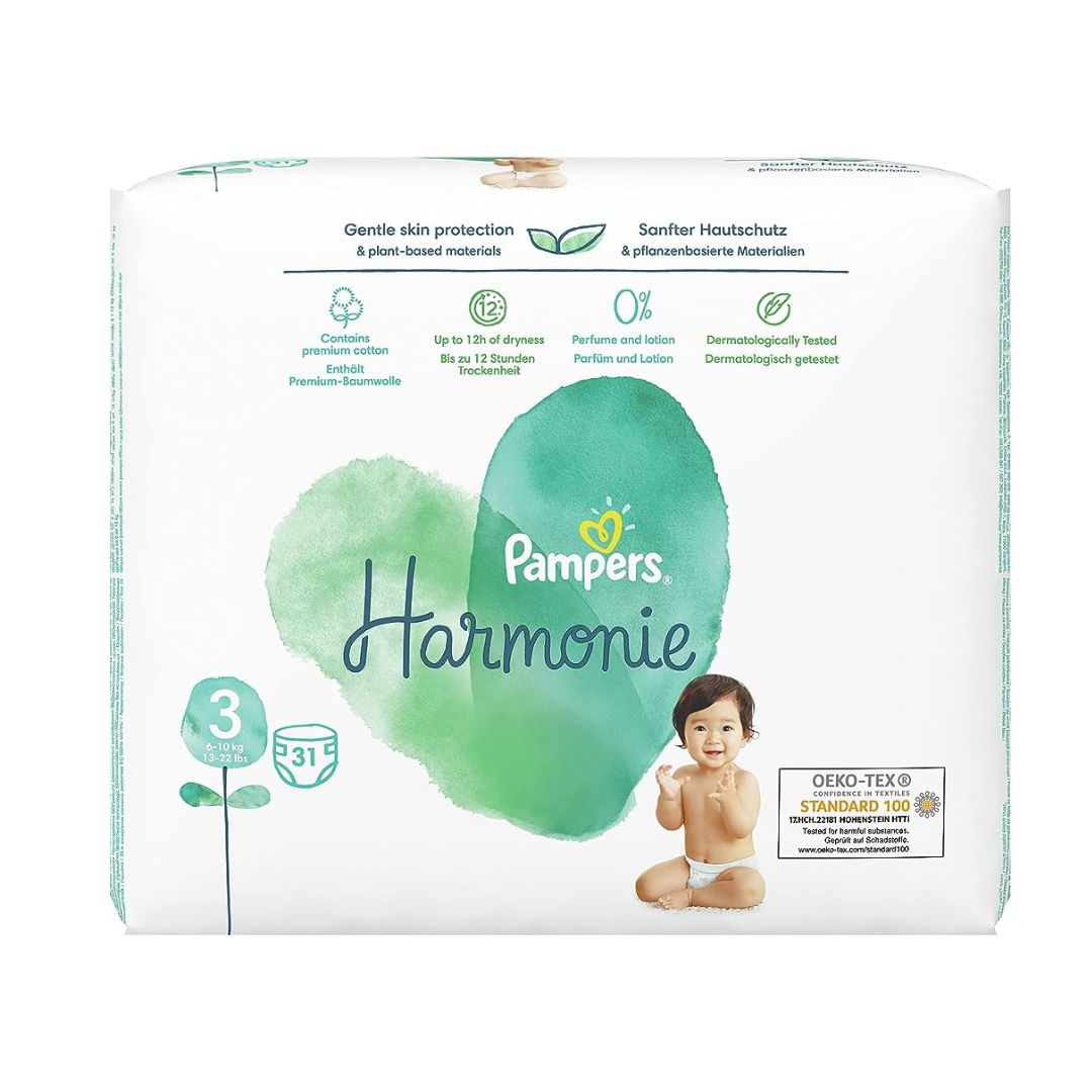 Pampers Harmonie diapers are crafted with premium cotton, soft plant-based materials, and other thoughtfully selected ingredients.