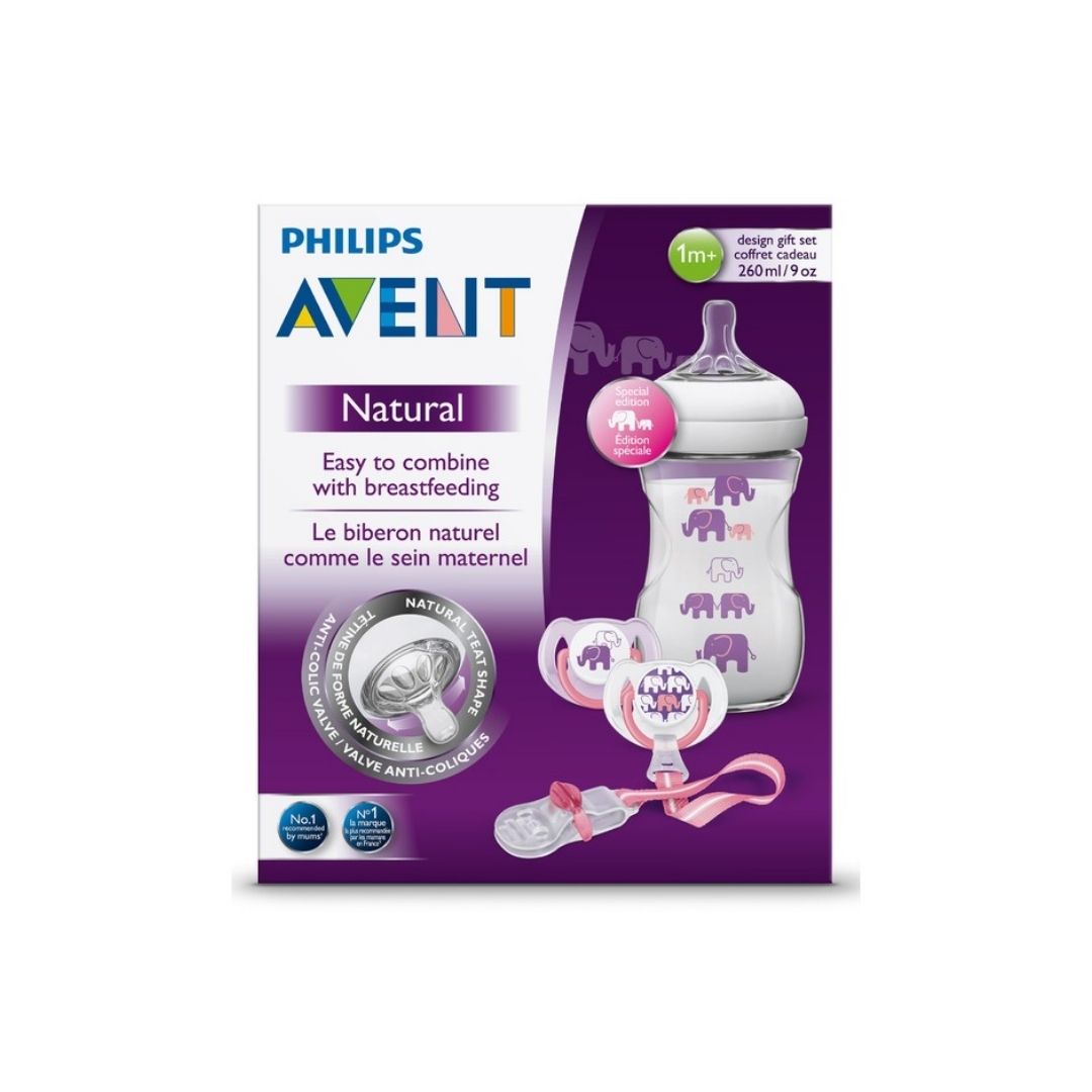 A handy collection including one Natural bottle, two soothers and a soother clip.