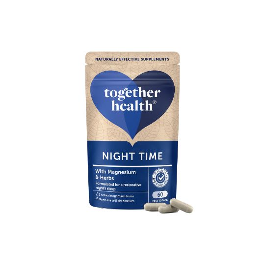 Together Health Night Time is a simple, naturally sourced evening formula designed to complement your bedtime routine. It combines marine magnesium from purified mineral-rich water (providing five natural forms of magnesium) with hops extract and 5-HTP from griffonia seed.