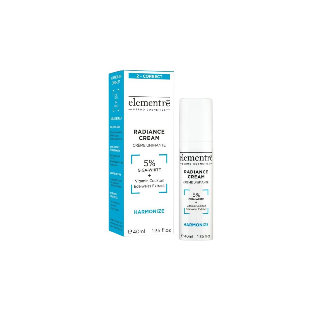 Elementre Radiance Cream është krijuar për të përkrahur një pamje më të ndritshme dhe më të njëtrajtshme të lëkurës, duke synuar shenjat e dukshme të hiperpigmentimit dhe zbehjes së shkëlqimit natyral. Formula kombinon kompleksin 5% Giga-White me përbërës mbështetës për komoditet dhe mirëqenie të lëkurës.