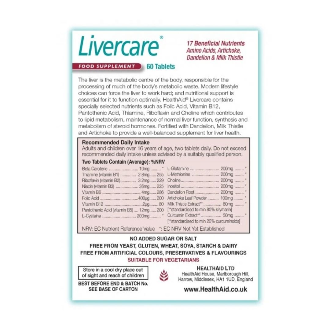 Suplementi HealthAid® Livercare është formuluar me kujdes, me përbërës të veçantë që kontribuojnë në shëndetin normal dhe detoksifikimin e mëlçisë.