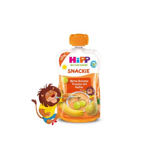 Pure e lëngshme me dardhë, banane, rrush dhe tërshërë.