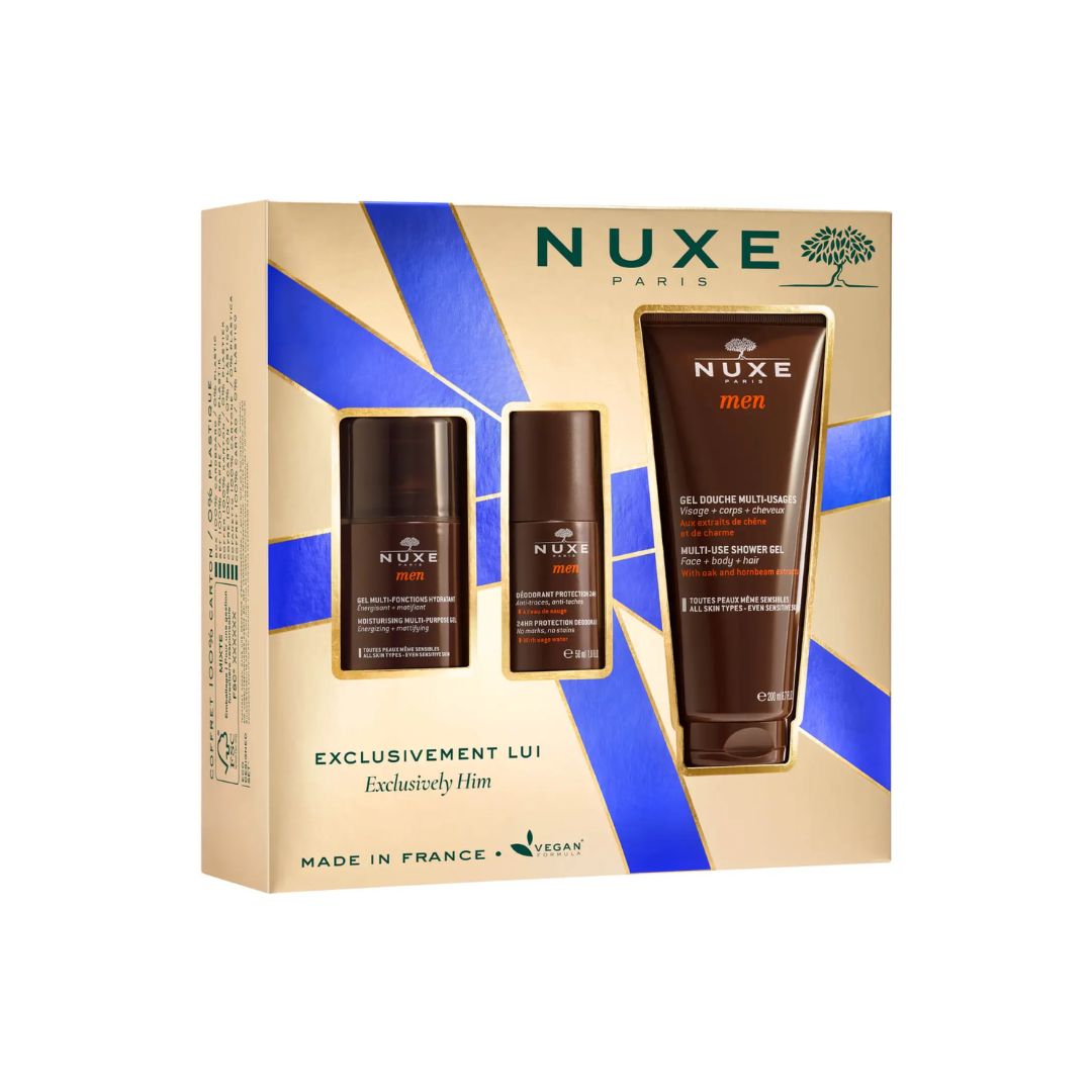 – NUXE Men Moisturizing Multi-Purpose Gel 50 ml– NUXE Men Multi-Use Shower Gel 200 ml– NUXE Men 24-hr Protection Deodorant 50 mlNuk përmban plastikë.