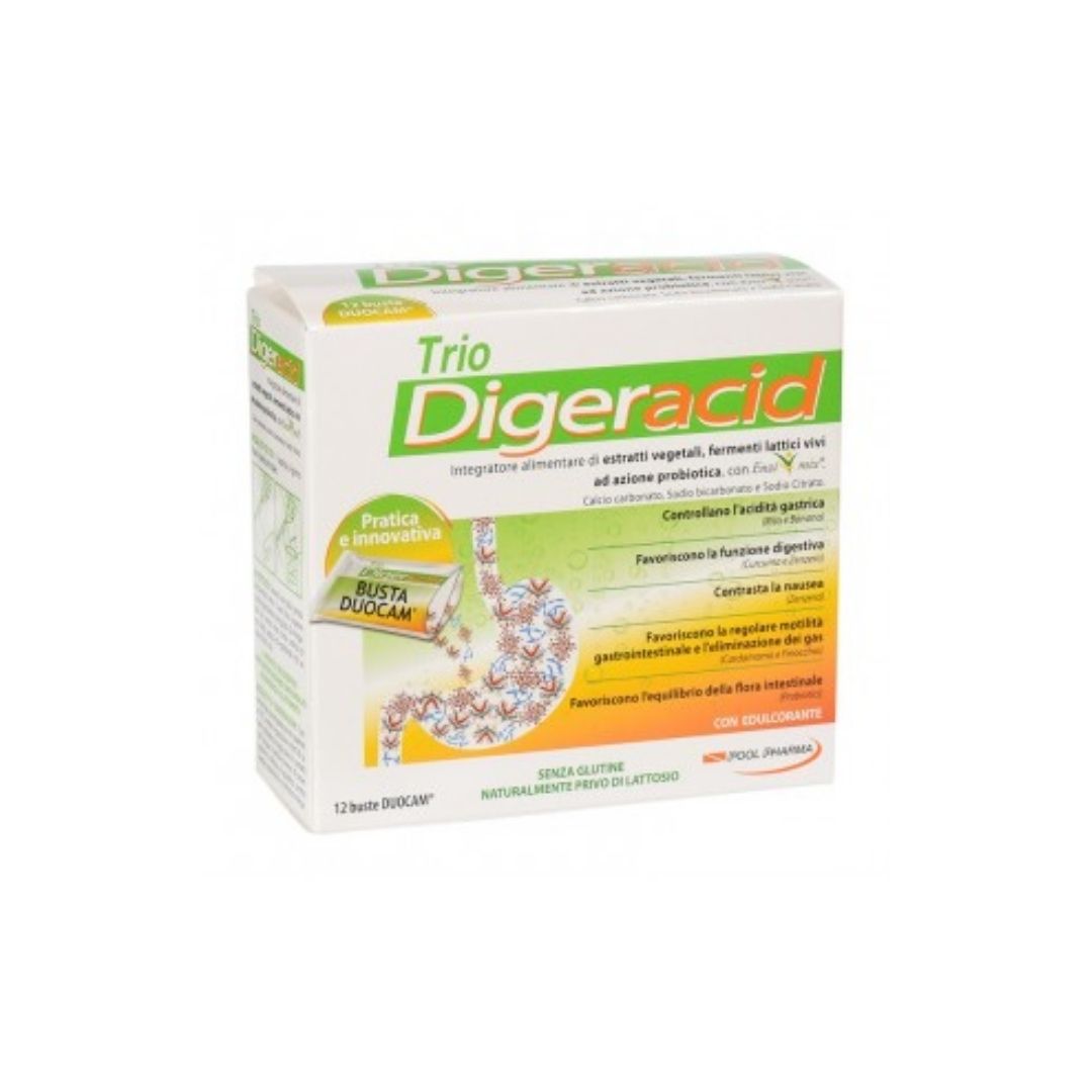 Trio Digeracid është një formulim në formën e granulave eferveshente, që kombinon kalçium karbonatin me bikarbonatin e natriumit, citratin e natriumit, vajra esenciale, ekstrakte bimore dhe fermente laktike.